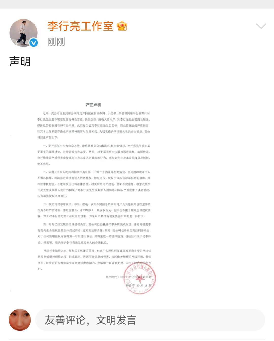 李行亮:首先会坚持用法律手段应对恶意造谣和诽谤,保护自己和家人的合法权益,目前我们已经请律师收集完网暴、辱骂、造谣等证据了,接下来会走法律程序。网络暴力对任何人来说都是伤害,不应该发生在任何人身上。其次,会通过日常分享和作品,让大家看到我和家庭真实、积极的生活状态,慢慢消除误解。信任的建立需要时间,我不会急于求成,只希望通过实际行动证明。