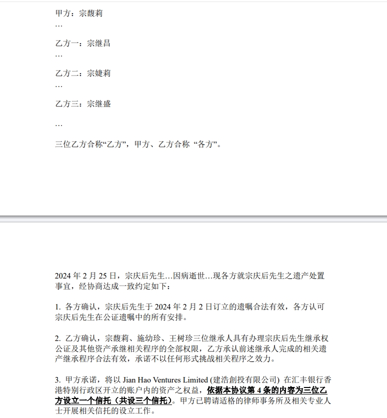 2024年3月14日,宗馥莉、宗继昌、宗婕莉及宗继盛就宗庆后去世引发的事宜订立了一份名为《协议》的文件,甲方为宗馥莉,乙方一宗继昌、乙方二宗婕莉、乙方三宗继盛。