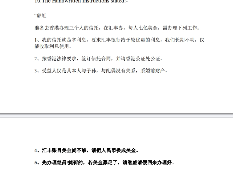 早在宗庆后去世前一个月,他曾给下属“郭虹写了一份“手写指示” ,要求郭虹“准备去香港,在汇丰银行设立三个信托基金,每个信托基金7亿美元”。按香港法律要求,签订信托合同,并请香港公证处公证。”“汇丰账目美金尚不够,请把人民币换成美金。先办理继昌 / 婕莉的,若美金募足了,请继盛请假回来办理好。”