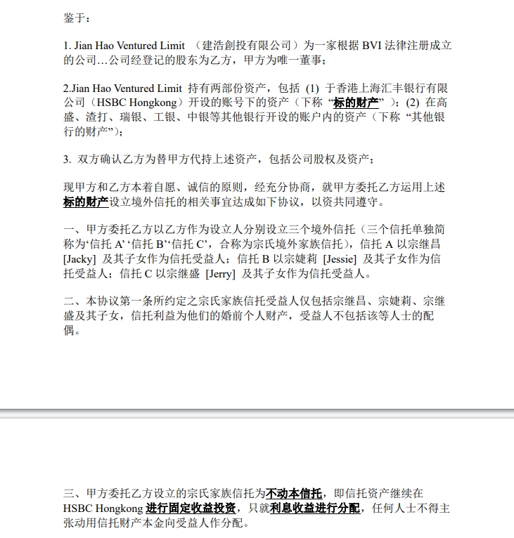 协议显示,当时两方确认宗庆后2024年2月2日订立的遗嘱合法有效,各方认可宗庆后先生在公证遗嘱中的所有安排。宗继昌、宗婕莉及宗继盛确认,宗馥莉、施幼珍、王树珍三位继承人具有办理宗庆后先生继承权公证及其他资产承继相关程序的全部权限,乙方承认前述继承人完成的相关遗产继承程序合法有效,承诺不以任何形式挑战相关程序之效力。宗馥莉承诺,将以建浩创投有限公司在汇丰银行香港特别行政区开立的账户内的资产之权益,为三位乙方设立一个信托(共设三个信托)。
