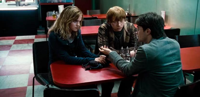 在《哈利·波特与死亡圣器(上)》——也就是这个史诗级结局的第一部分里,哈利、罗恩和赫敏因为食死徒突袭比尔和芙蓉的婚礼,只能匆忙逃离。他们逃到一家咖啡馆,想先观察一下周围的情况。