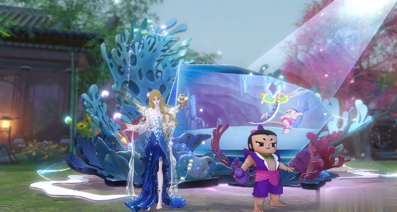 当然,除了这“硬核”的动画播放功能,【幻世迷镜】本身的颜值也绝对能打!巨型石镜冰透莹润,在蓝紫珊瑚丛的层层簇拥下,显得神秘而华丽。珊瑚上还点缀着细碎的荧光,仿佛星辰洒落。旁边粗粝的石桌石凳,古朴而舒适,随性一坐,就能沉浸在这片童年与仙境交织的梦幻世界里,一看就是一整天!