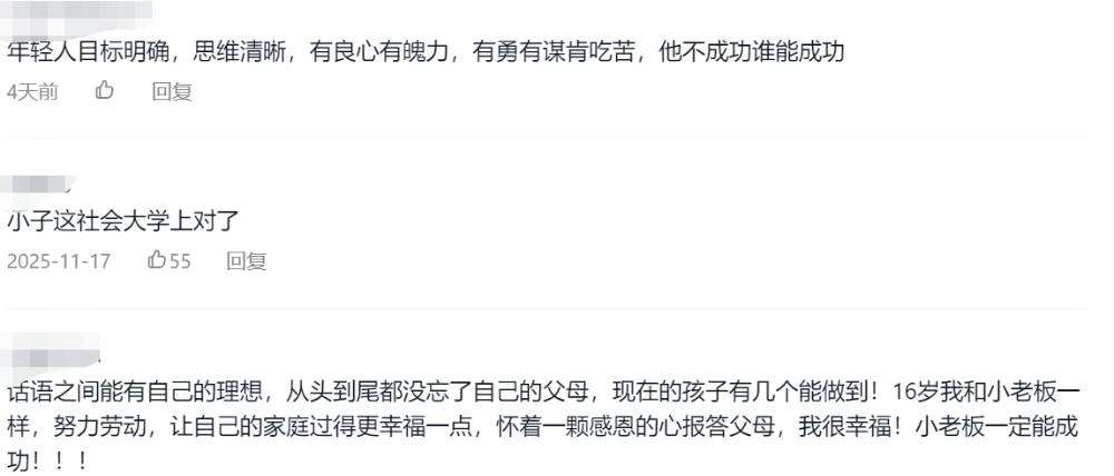 这个16岁少年在本该做梦的年纪,却已经学会了用行动筑梦。他在视频账号上分享的心得,或许正是他成功的密码:“思考、行动、坚持、自律”。 流量会来也会走,但小陈明白,真正能留住客人的,永远是烤鸡的味道和做人的诚意。就如同他向鹤九展示的从东莞运过来的荔枝木烤制一样,对烤制细节的执着,让少年烤鸡的火爆不止于流量,更在于探店博主们发自内心的那些惊叹:“真的外焦里嫩”;“现在原生态烤制的东西不多,这个真的好吃”……