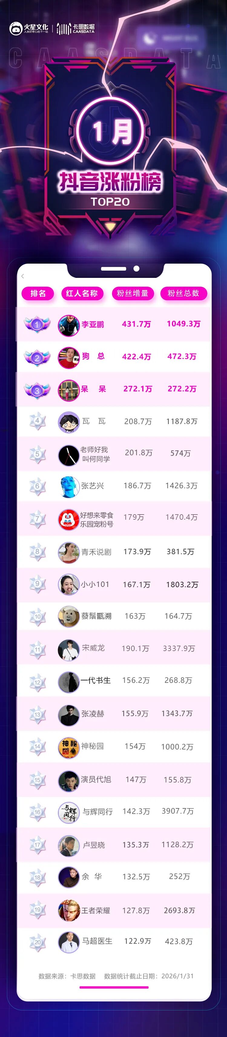 以上就是卡思对1月涨粉榜的全部分析。1月过后,2026年接下来的日子是否会有更多惊喜出现?我们一同期待。