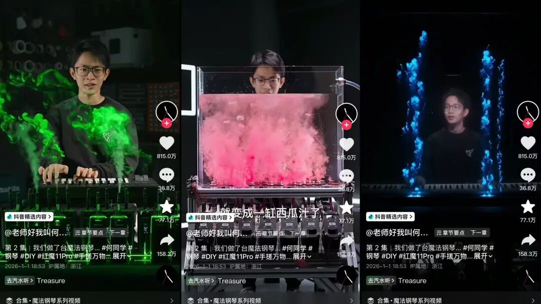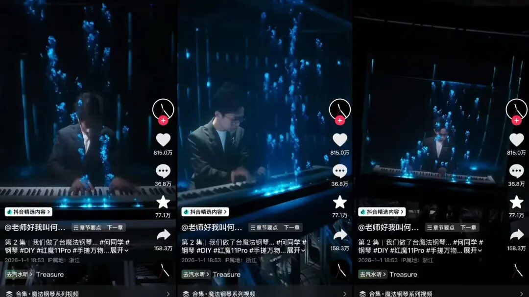 @老师好我叫何同学, 于2026年1月1日发布了一条“魔法钢琴”的制作视频,瞬间引爆内容圈,收获815W点赞。