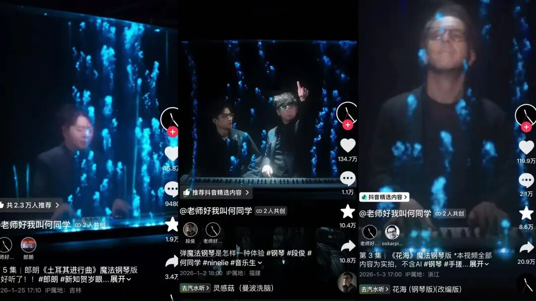 毫无疑问,这架魔法钢琴通过大自然与科技的浪漫组合,让旋律以流动的形态被肉眼捕捉,前所未有的视听体验给众多用户带来了巨大的震撼和冲击。后续,何同学还特别邀请郎朗、段俊等钢琴家前来弹奏了《野蜂飞舞》《土耳其进行曲》等经典钢琴曲目。其中,段俊的高频露面一度引来了“再弹要把里面的藻类弹死了”的搞笑调侃。专业选手的参与不仅让魔法钢琴绽放出了更耀眼的光芒,也进一步助推了作品的传播热度,使其成为开年首个现象级内容。