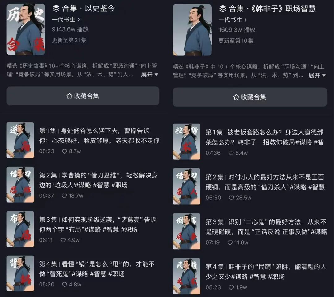 其内容的最大特色就是将历史知识与当代的职场权谋深度绑定,一边严谨拆解历史事件、剖析人物博弈逻辑,一边以“职场视角”重构历史解读,聚焦历史中的朝堂博弈、派系纷争、人际相处等场景,拆解其中的权衡之术、沟通技巧等,再精准对照当代职场的协作、人际沟通、利益权衡等核心痛点,给出可落地的解决方法。通过这种独特的结合方式,历史不再是遥远的过往,而是成为可借鉴的“职场生存指南”,既满足了用户的知识获取需求,又实现了内容的实用价值落地,这也是账号能持续吸引用户、快速涨粉的重要支撑。