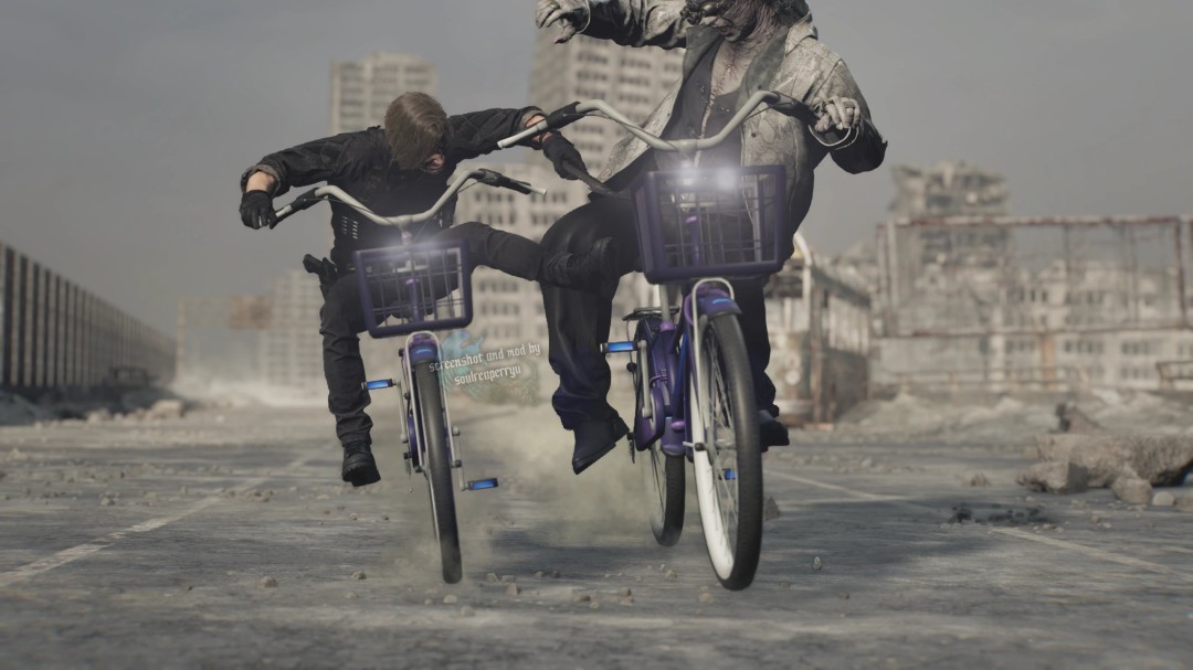 这款名为“Bicycle”的MOD由Nexus Mods用户TLordArbiter制作,在游戏发售后不久上传至各大MOD社区,短短几天内便收获数千下载量。MOD的效果简单粗暴:直接将原作中里昂与反派维克托在废墟城市间的高速摩托车追逐戏份,替换为两人骑着普通自行车奋力狂飙的画面。更绝的是,里昂的座驾前方还配有一个经典的购物篮,画面极度违和却又意外地喜感十足。玩家们在原本紧张刺激的追逐战中,看到里昂用力蹬着踏板、反派维克多举着火箭筒却骑在单车上,瞬间将一场动作大戏变成了荒诞喜剧。