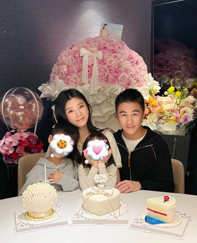 一双儿女中,儿子何广燊坐在奚梦瑶左侧,身穿灰色连帽衫,虽面部被花朵贴纸遮挡,但从身形与姿态可见其活泼可爱;女儿则坐在母亲右侧挨着父亲何猷君,她穿着浅色毛衣,别看小公主才4岁,但面向镜头的她双手捧着脸蛋很会摆pose。